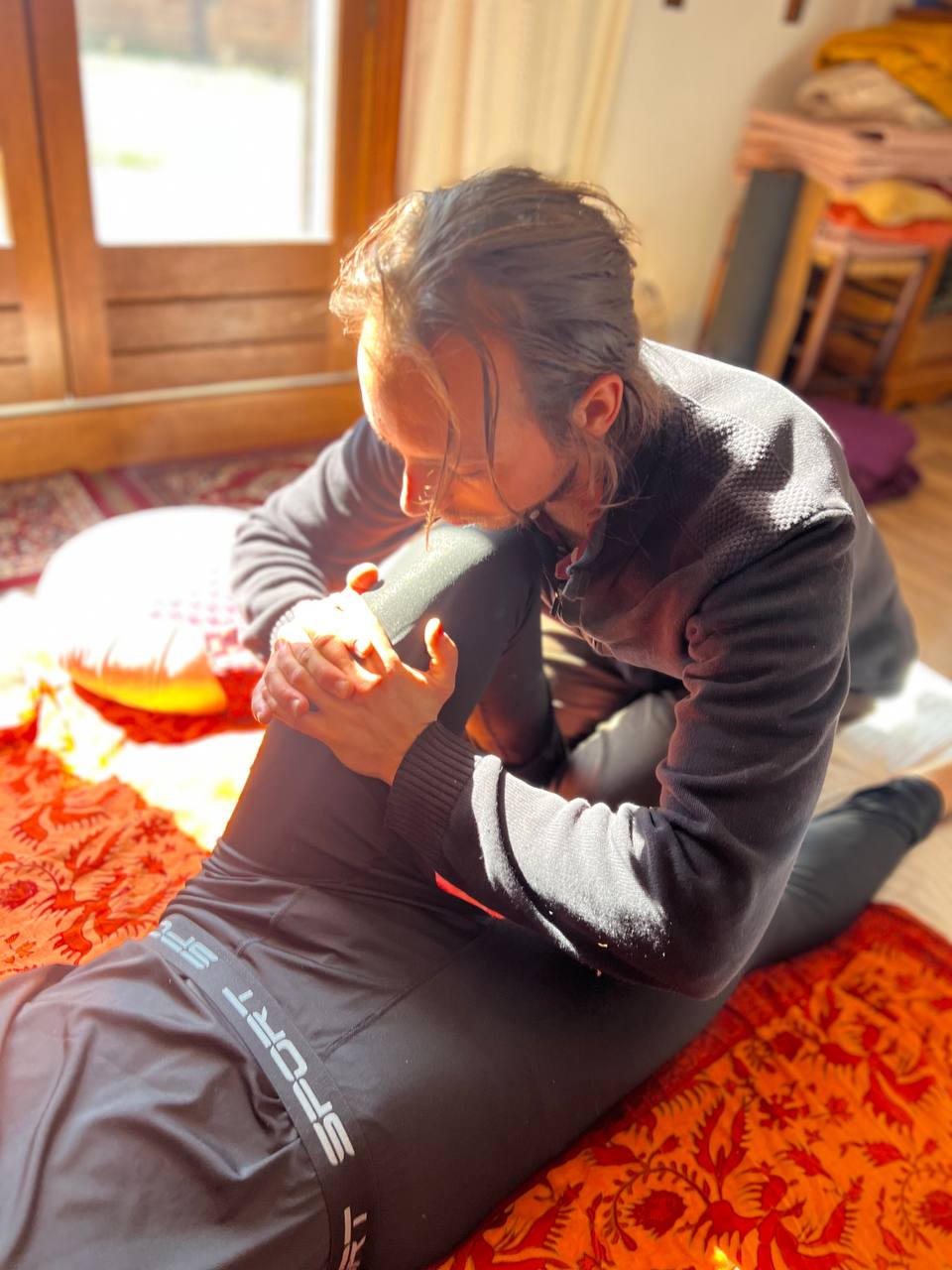 En août 2024, je participe à un stage de 5 jours pour apprendre le massage thaïlandais , organisé par mon ami Cyril Giraud (Tymainsage) dans un éco-lieu en Lozère. C’est le cycle 1 où on apprend à masser lorsque le receveur est sur le dos.